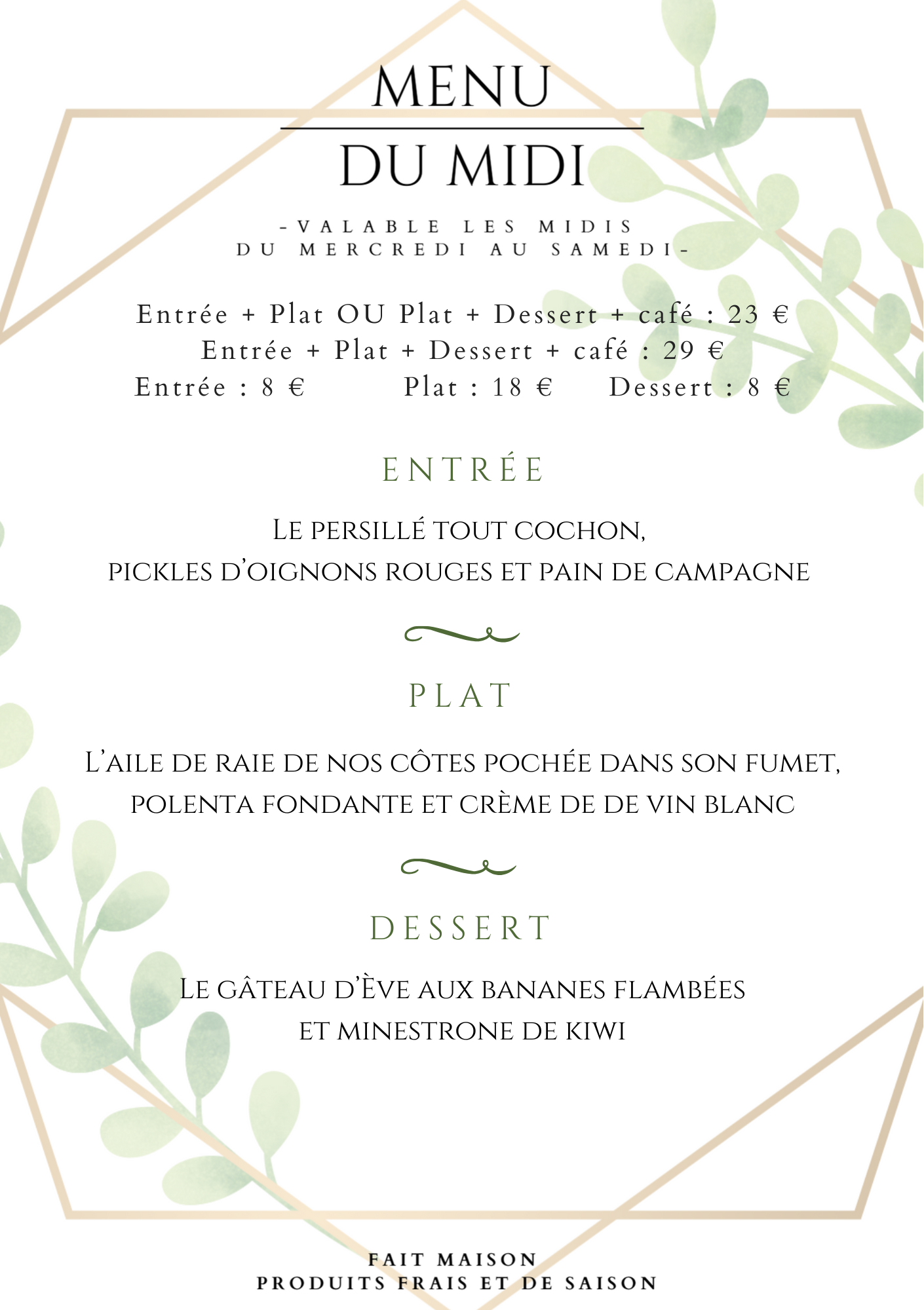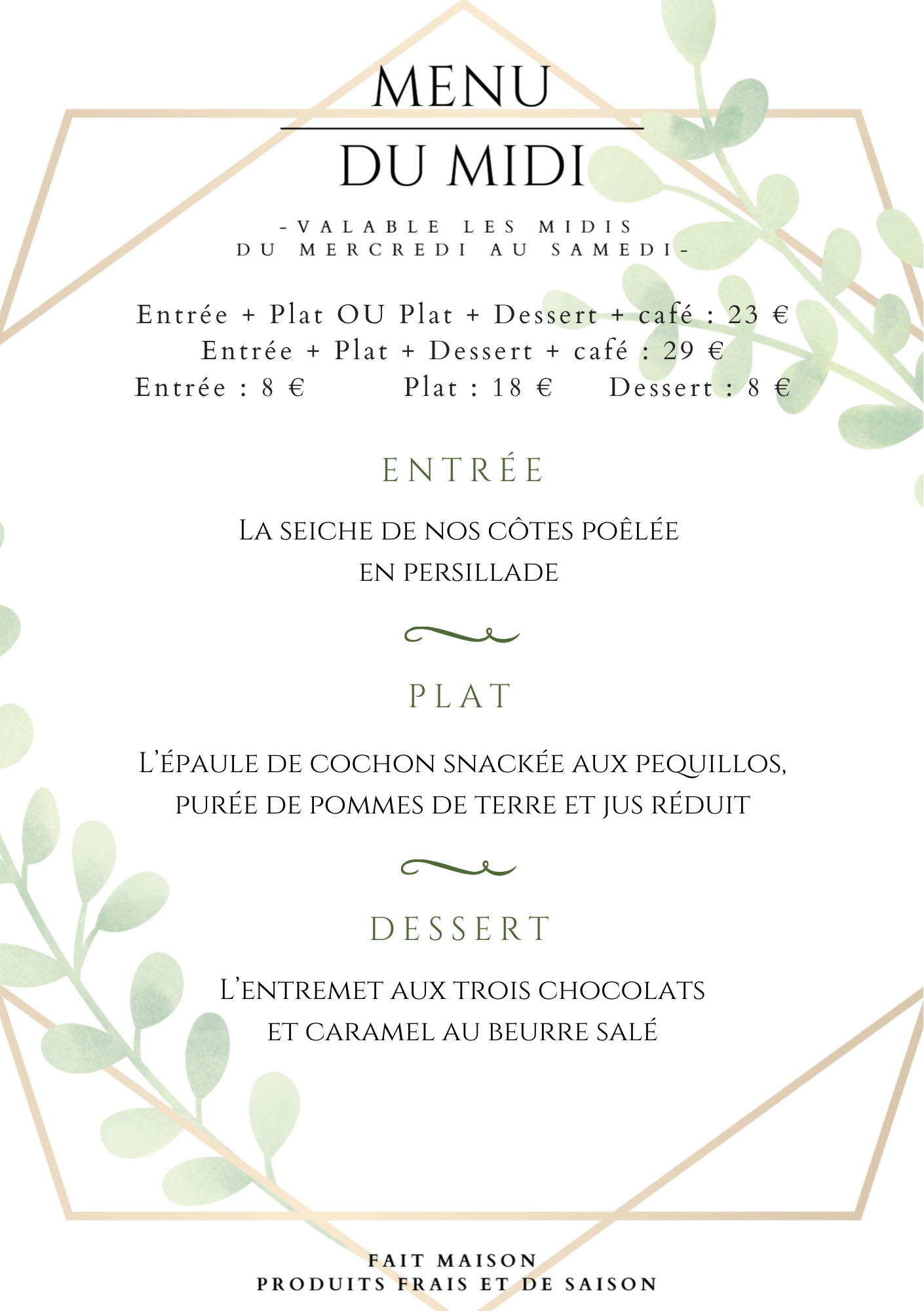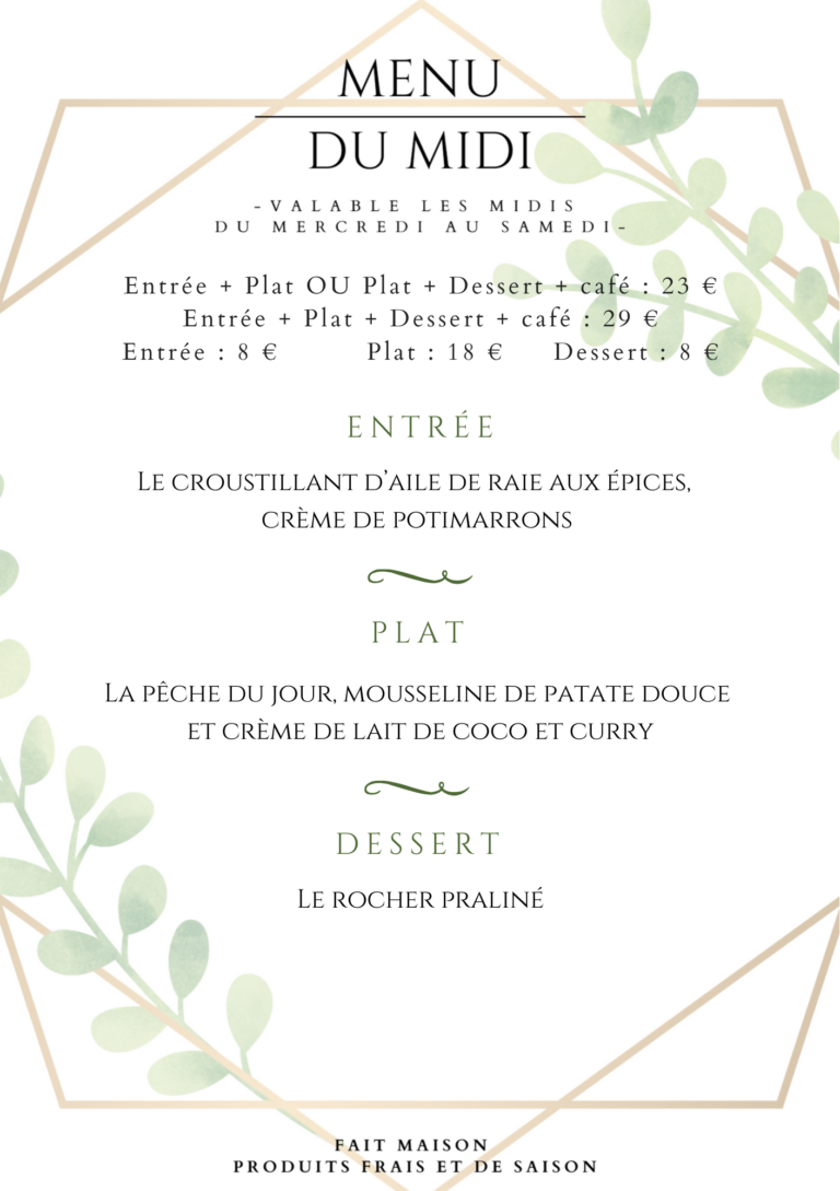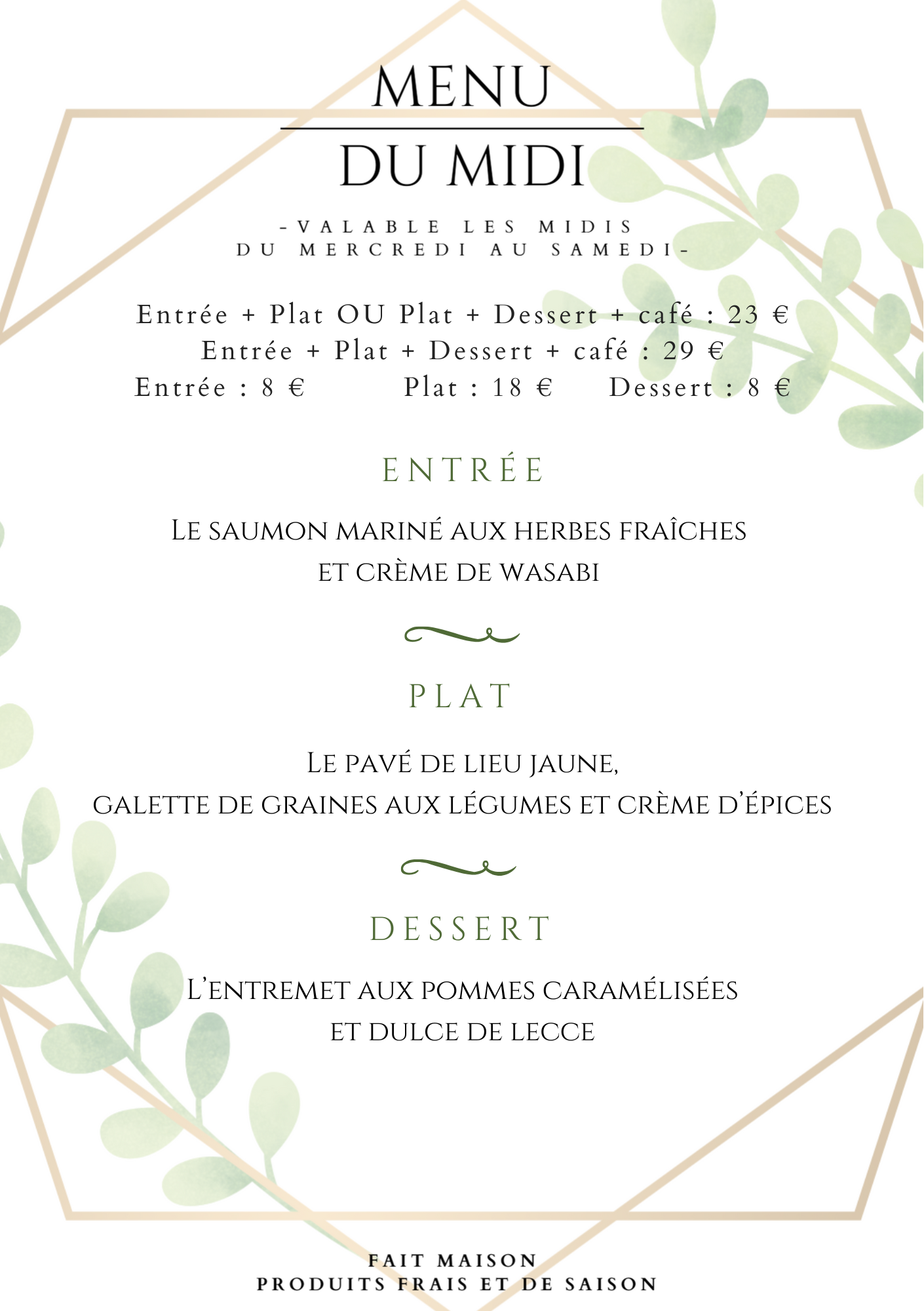 Oui, tous les midi du mercredi au samedi, nous proposons un menu unique qui change chaque semaine élaboré à partir de produits de saison. L’occasion de découvrir régulièrement de nouvelles créations du chef à un prix accessible. Ce menu est proposé à 29 € (Entrée/Plat/Dessert/Café) ou 23 € (Entrée/Plat/Café ou Plat/Dessert/Café).