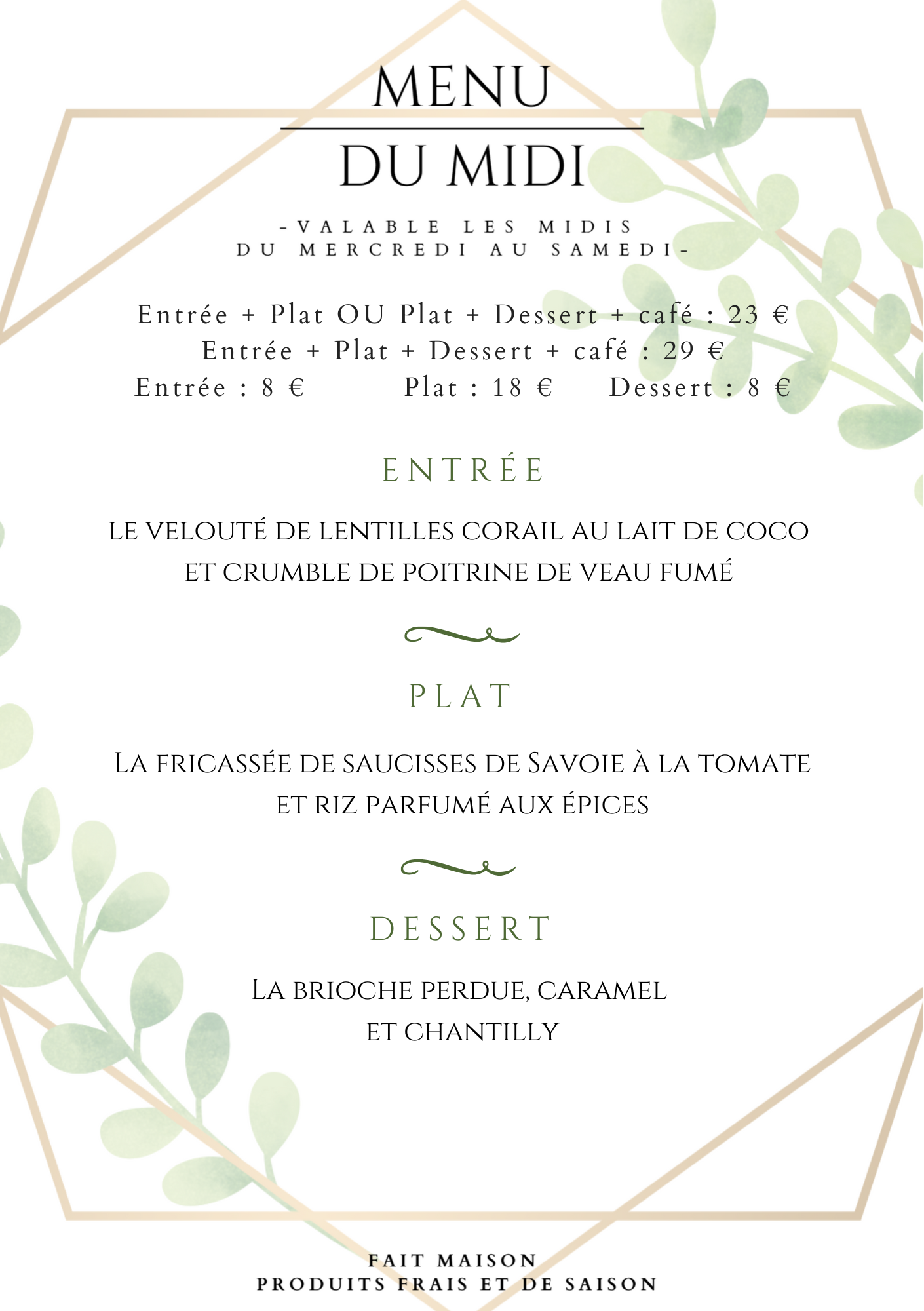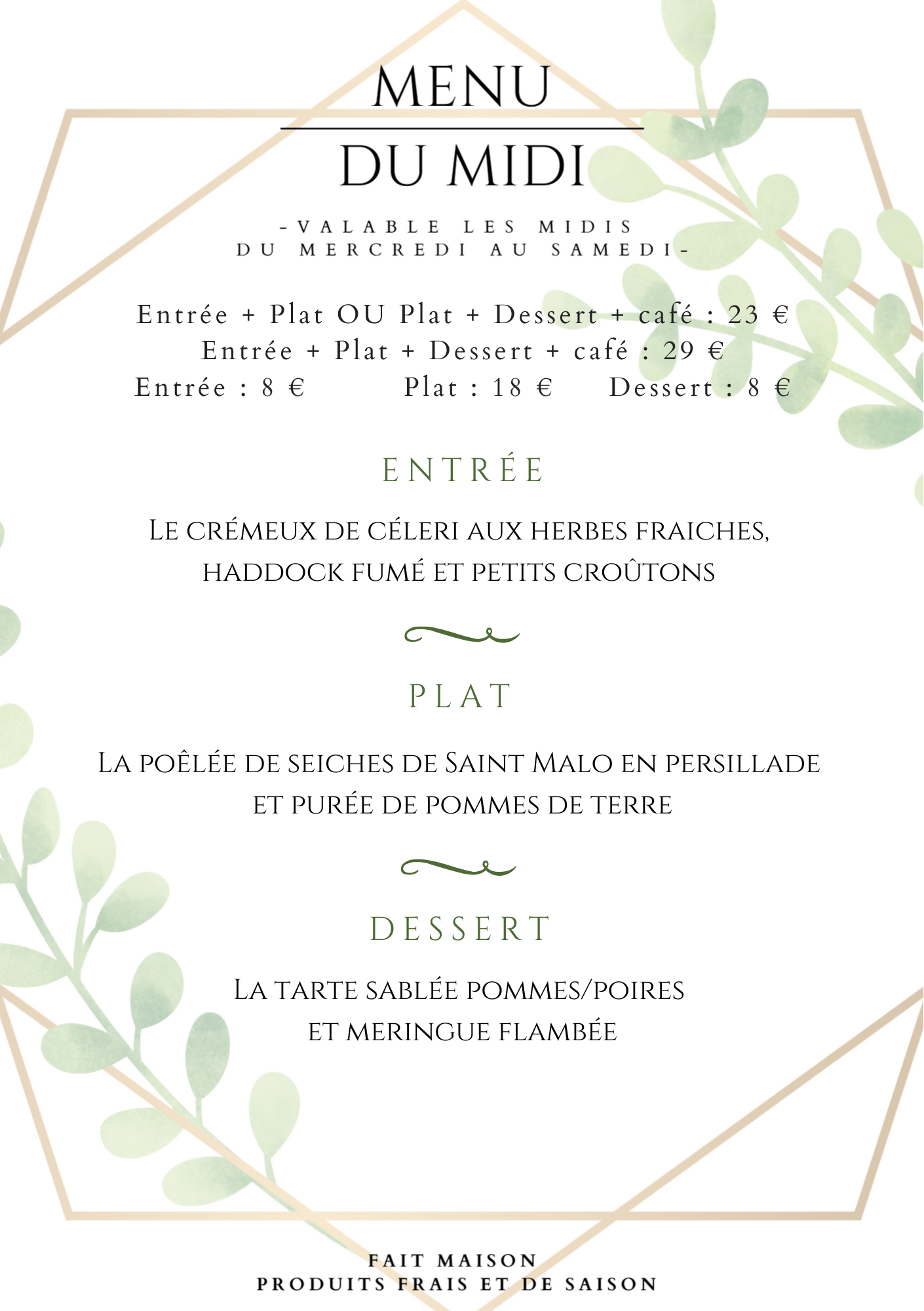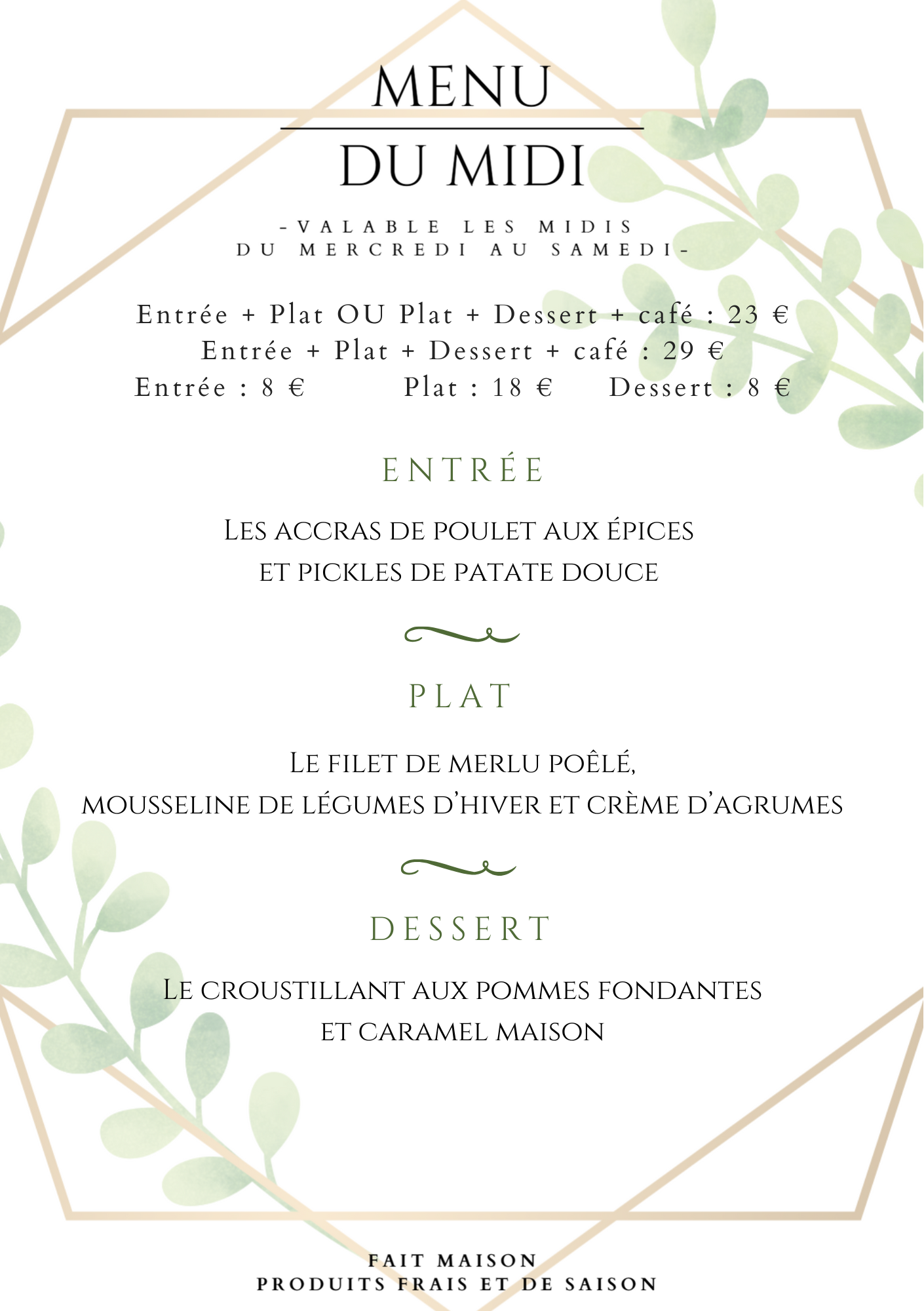 Oui, tous les midi du mercredi au samedi, nous proposons un menu unique qui change chaque semaine élaboré à partir de produits de saison. L’occasion de découvrir régulièrement de nouvelles créations du chef à un prix accessible. Ce menu est proposé à 29 € (Entrée/Plat/Dessert/Café) ou 23 € (Entrée/Plat/Café ou Plat/Dessert/Café).