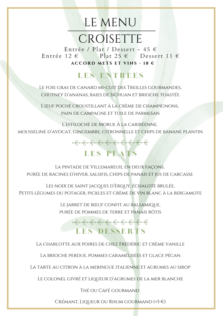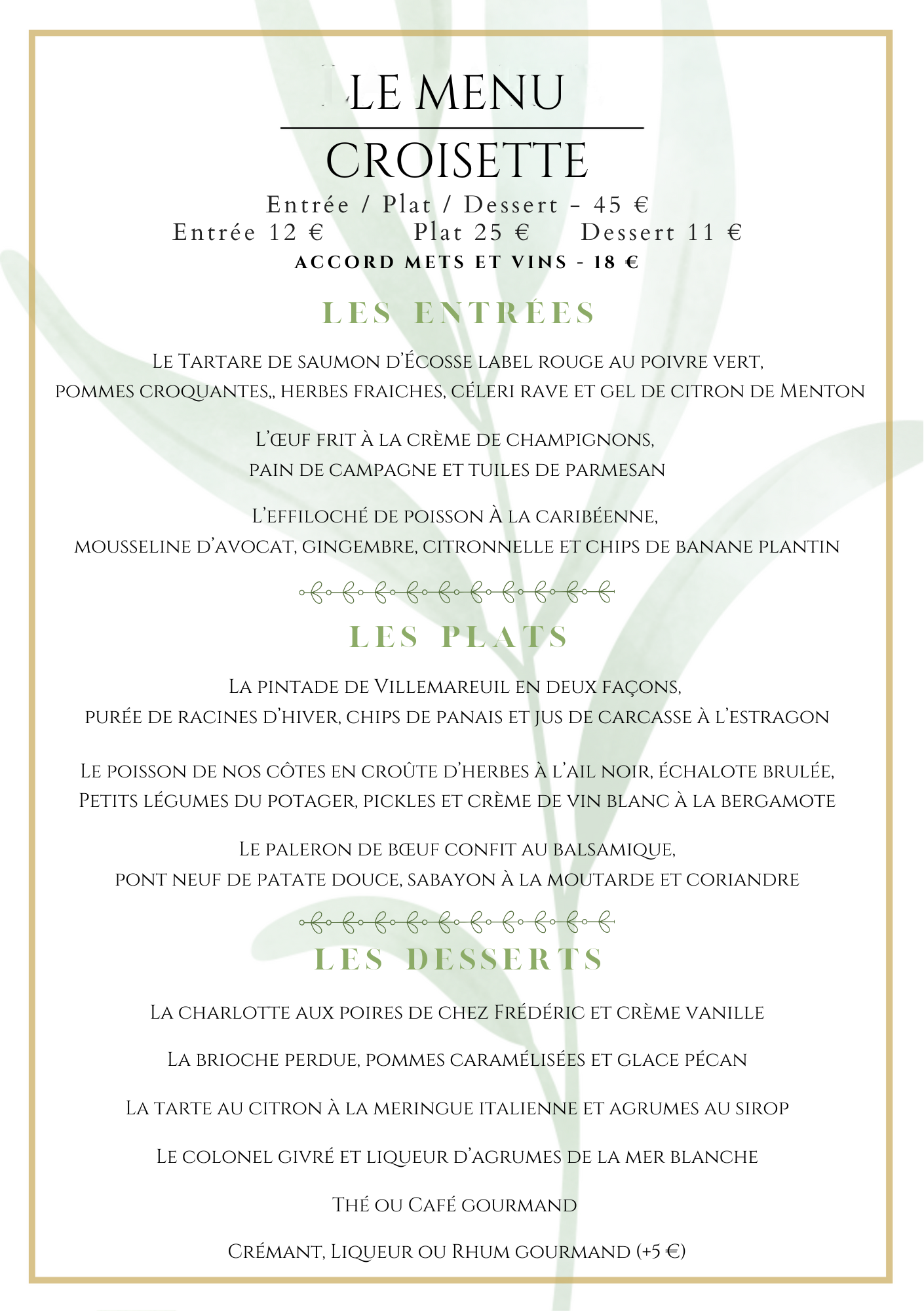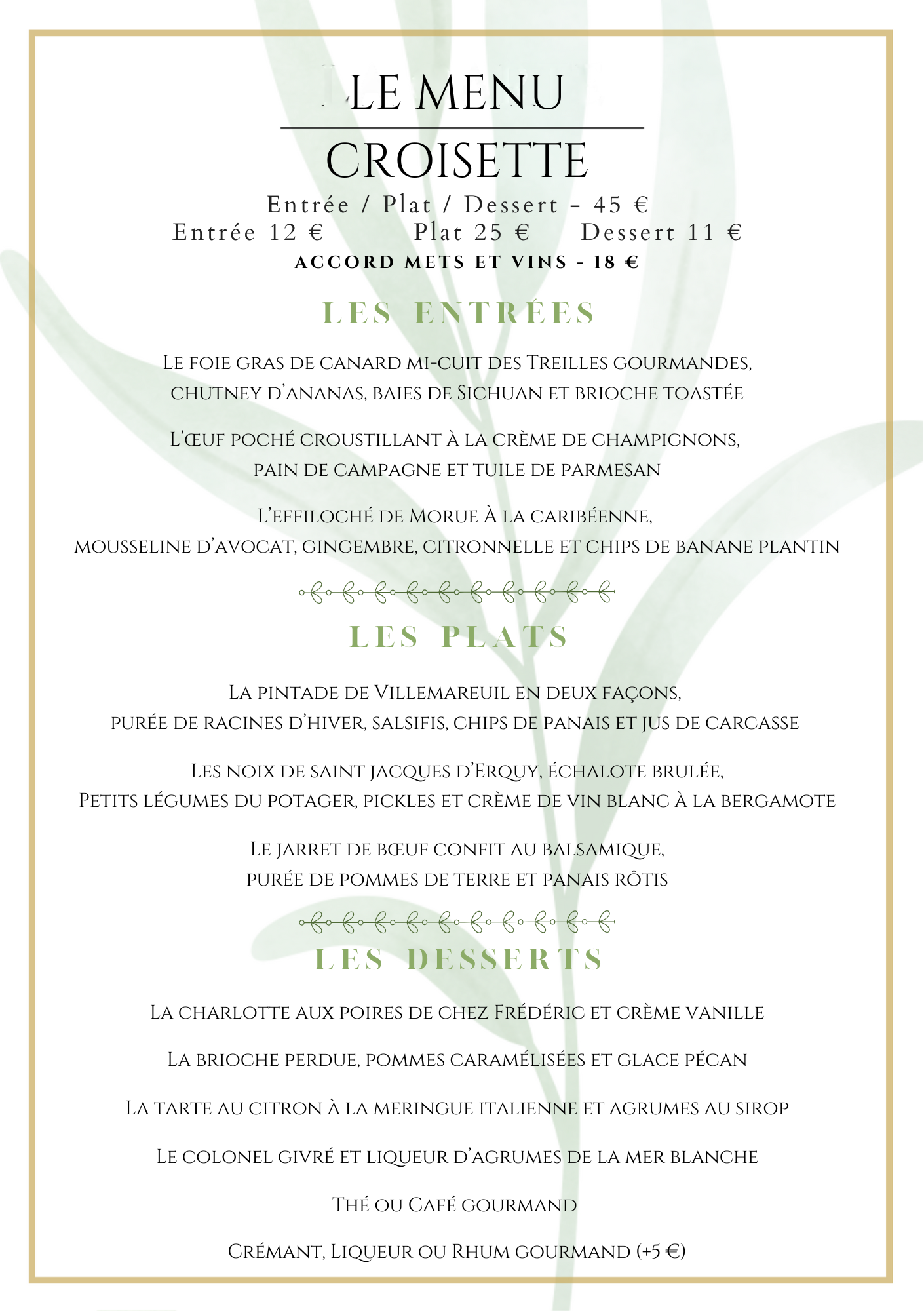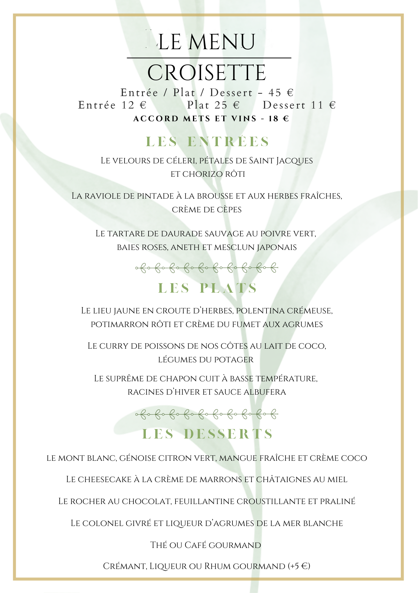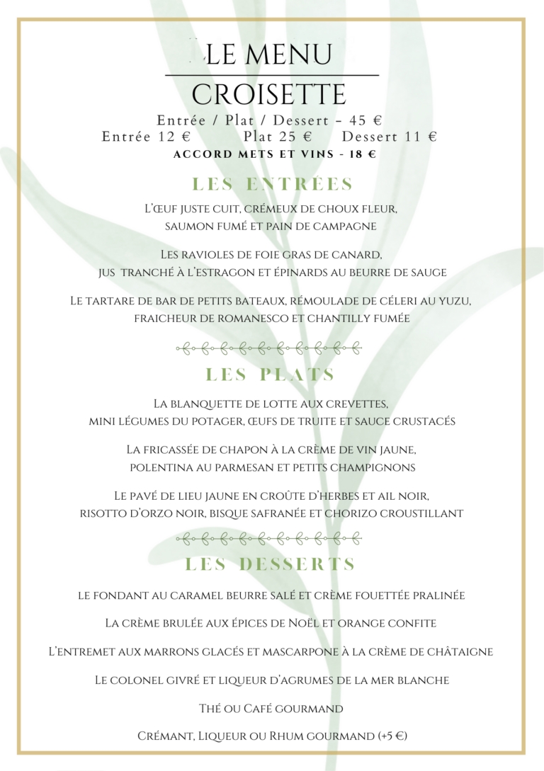 Nous vous proposons notre Menu Croisette ainsi que la Carte du Chef, qui change chaque mois pour surprendre vos papilles. Le midi, découvrez également un menu unique qui évolue chaque semaine. Ainsi, chaque repas devient une expérience nouvelle, toujours guidée par le goût et la saison.
