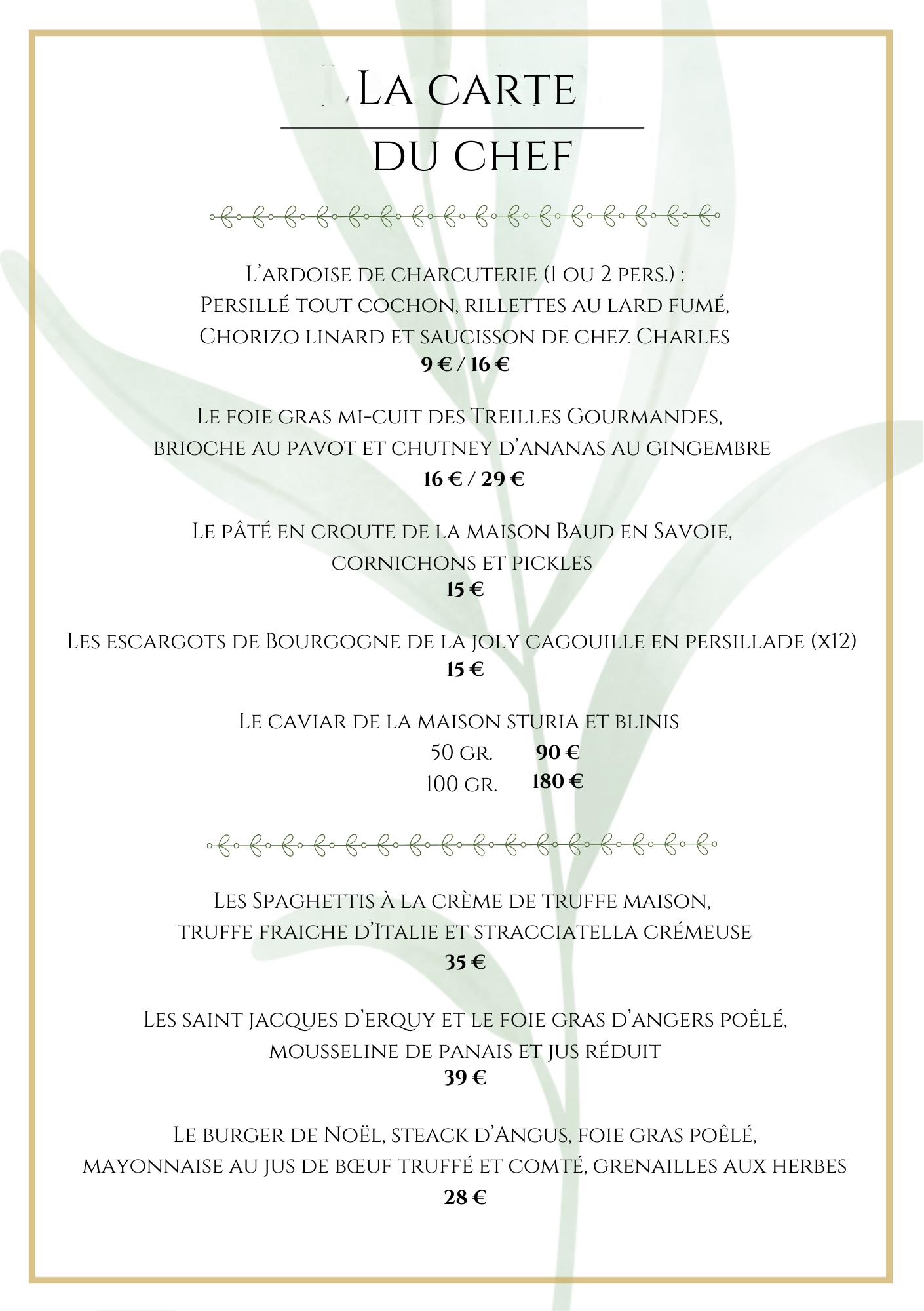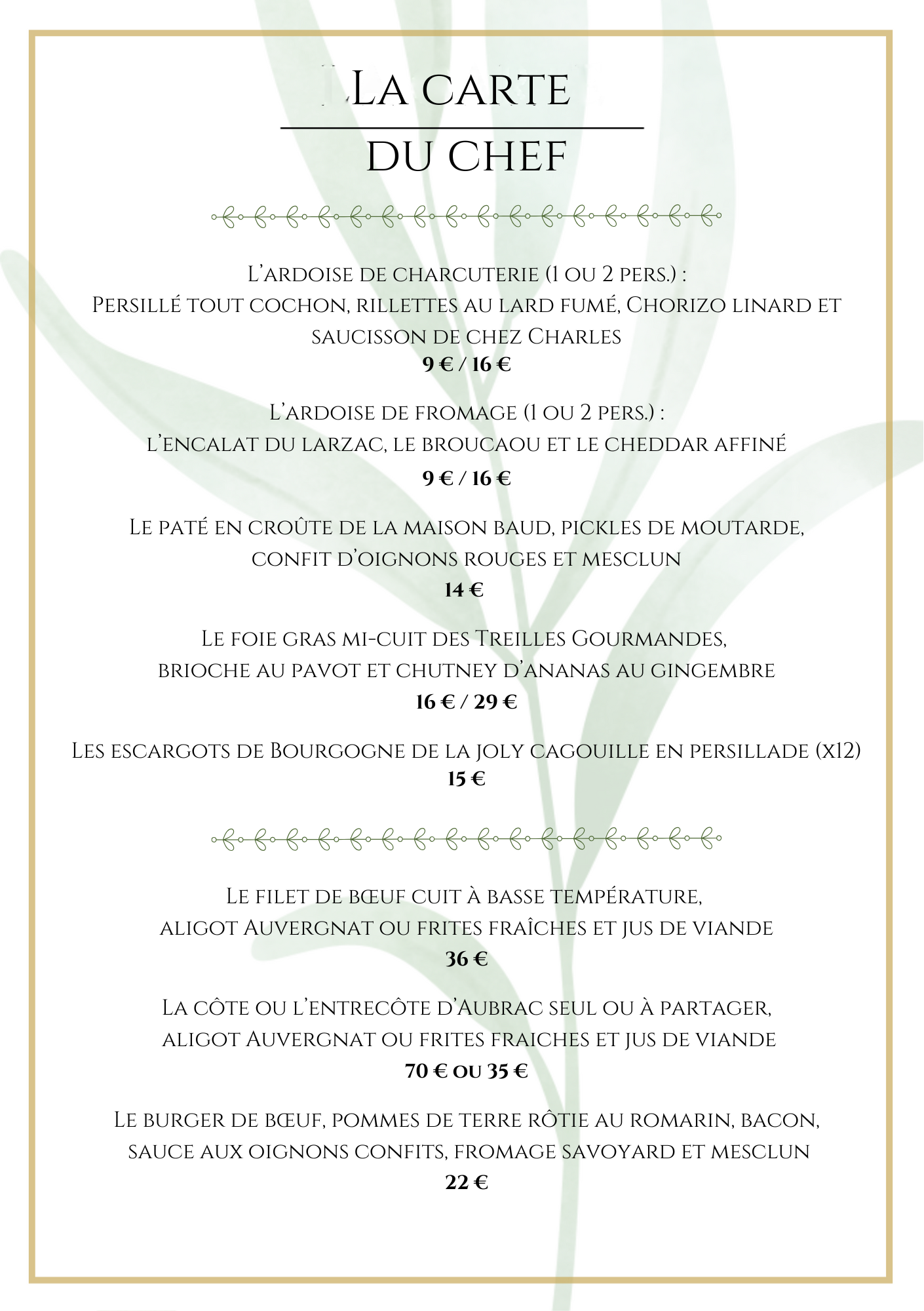 Nous proposons une cuisine française traditionnelle et inspirée d’autres cultures. Notre cuisine raffinée et contemporaine est sublimée par la nature et le rythme des saisons. Notre carte change tous les mois donc vous aurez l’occasion de déguster de nouveaux plats à chaque venue.