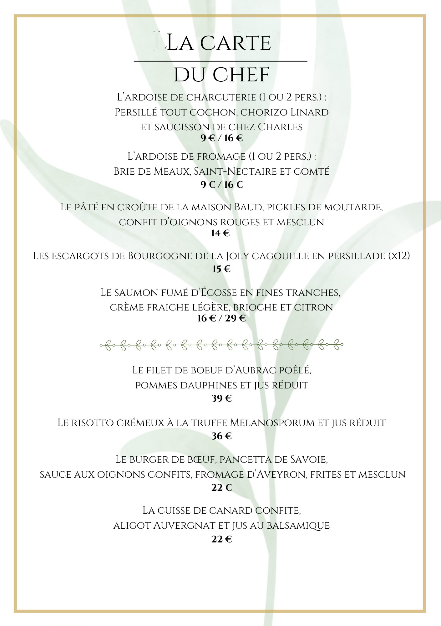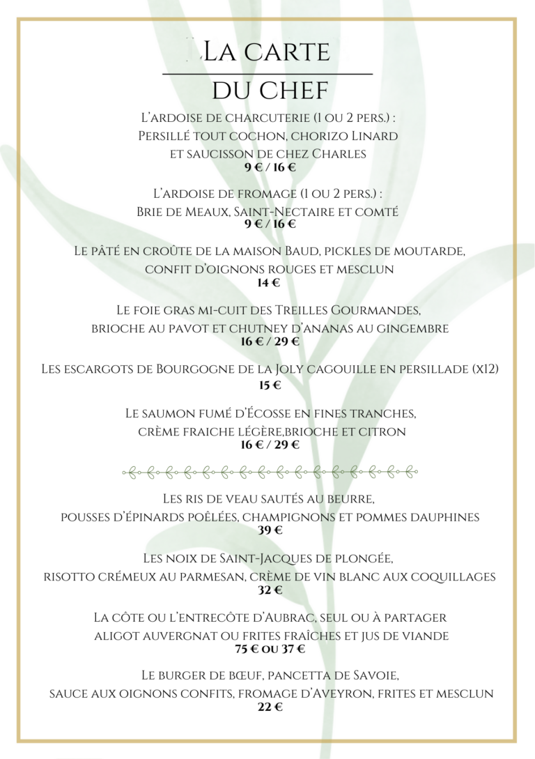 Une cuisine traditionnelle française, où chaque ingrédient trouve sa juste place, où chaque bouchée révèle un équilibre entre authenticité et raffinement. C’est une cuisine vivante et généreuse que nous vous proposons, tournée vers le goût du vrai. Notre cuisine s’enracine dans des relations durables avec des producteurs français.